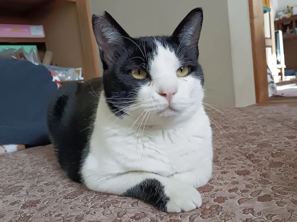 まんまるなお顔がなんともかわいい、ハチワレの男の子。